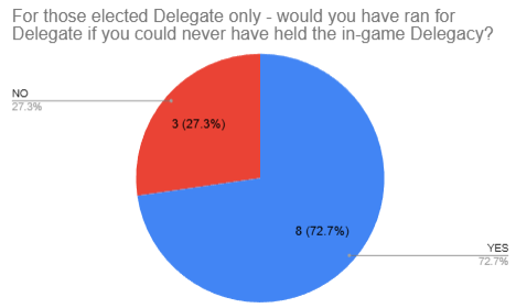 There are also reasons to hesitate, I admit, although I’m personally in favor. I’ve heard in the past that the achievability of being Delegate is a big political motivator for new folks. I’ve also heard that it helps for the head honcho gameside to be the head honcho gov-side, since it’s the big obvious person to both contact and look up to. I’m sure there will be other points raised. These feelings are valid.